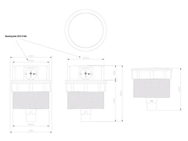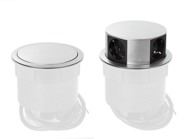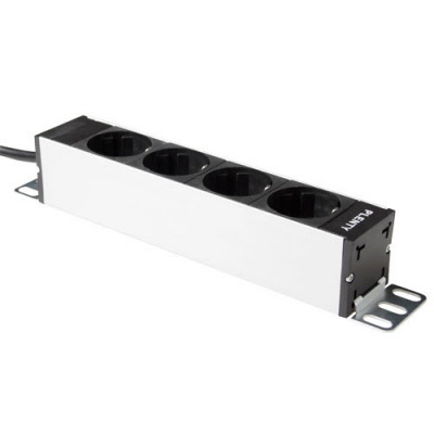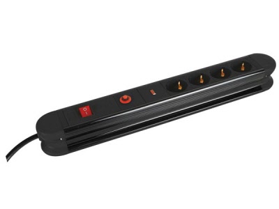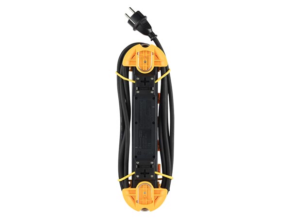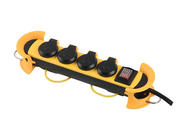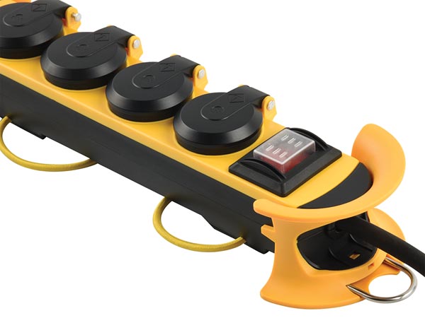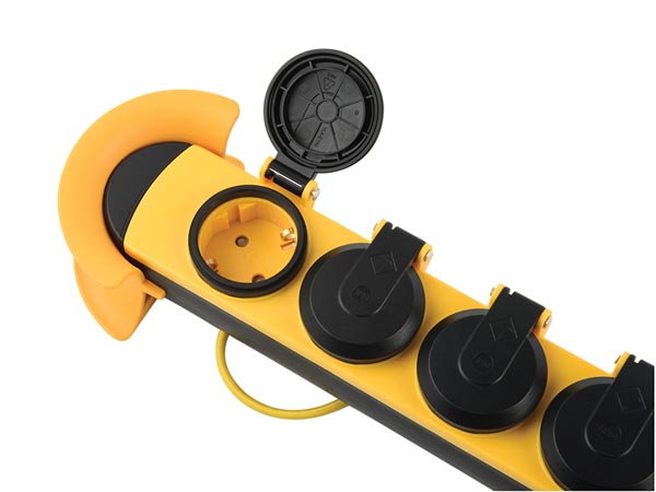 Stekkerdoos met contactdozen met randaarde onder een hoek van 45°, zodat ze ook geschikt zijn voor haakse stekkers
