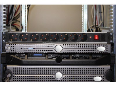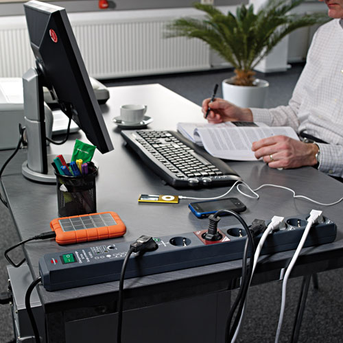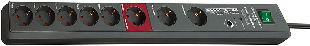met digitale master/slave functie en overspanningsbeveiliging. Beveiligt waardevolle apparaten tegen overspanning met een max. lekstroom tot 19.500 A. De hoofdschakelaar of "master" stuurt de volgschakelaars "slaves" aan. Als de voeding, die in de master is geplugd, in de aan of uitstand wordt geschakeld, volgt de perifierie de slaves door de aangesloten toestellen trapsgewijze aan en/of uit te schakelen. Tevens 2 permanente outlets. Verlichte veiligheidsschakelaar, tweepolig in/uitschakelbaar. Stopcontacten met kinderbeveiliging in handige opstelling van 45°