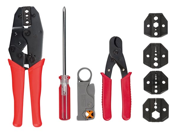 Professionele krimptang voor F-, BNC-, TNC-, N-connectoren, optische vezelconnectoren, in elkaar grijpende connectoren, adereindhulzen en geïsoleerde en niet-geïsoleerde hulzen.