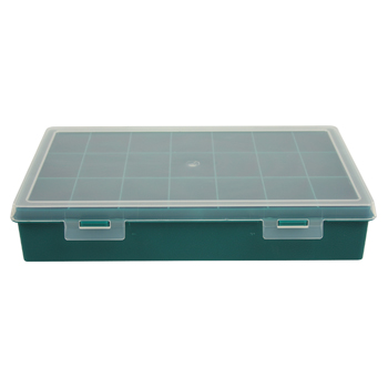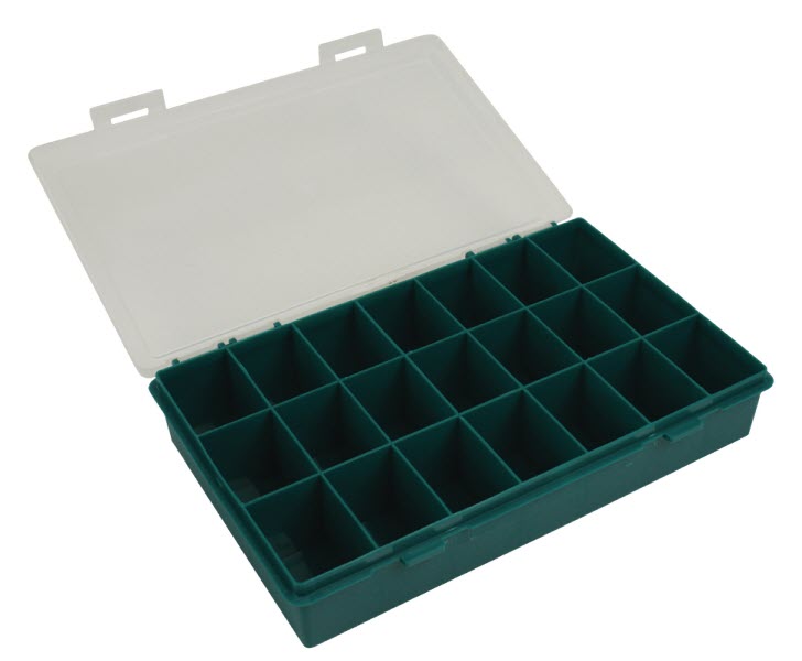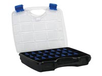 Assortimentsdoos van verstevigd kunststof met 21 compartimenten. Voorzien van een doorzichtige deksel om de inhoud te laten zien.