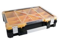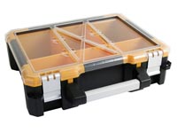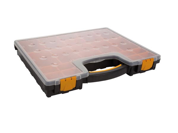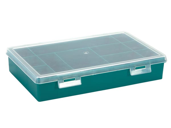 Assortimentsdoos van verstevigd kunststof met 11 compartimenten van verschillend formaat. De doorzichtige deksel maakt het mogelijk om de inhoud te zien.