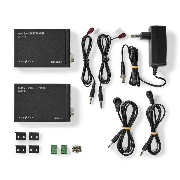 4K@60Hz 60 meter | 4K@30Hz 70 meter | 1080p@60Hz 70 meter | 18Gbps | IR | Power Over Cable | EDID | 4:4:4 | HDMI local loop | schroefbare stroomaansluiting | afneembare montagebeugel