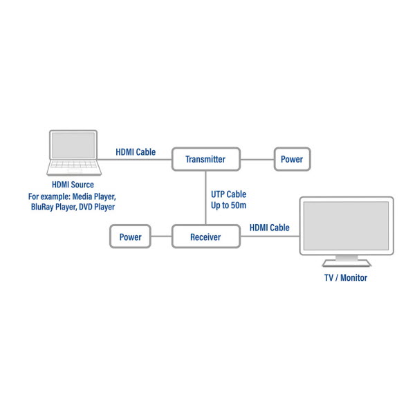 De HDMI extender set ondersteunt bi-directionele Power over Cable (PoC) via CAT6 UTP. De transmitter/zender kan de receiver/ontvanger van stroom voorzien, maar de receiver kan de transmitter ook van stroom voorzien. De stroom gaat via de aangesloten UTP-kabel.