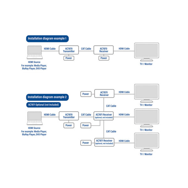 De AC7811 HDMI 2.0 extender set verlengt een HDMI-signaal over een afstand van 60 meter met een resolutie van 4K@60Hz. Verleng het HDMI-signaal met een resolutie van 4K@30Hz of 1080p@60Hz over een afstand van 70 meter.