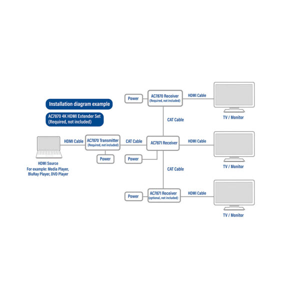 Verleng een HDMI-signaal met een resolutie van 4K@60Hz over een afstand van 60 meter met de AC7811 HDMI 2.0 extender set. De set ondersteunt bi-directionele Power over Cable (PoC), wat betekent dat de receiver/ontvanger stroom krijgt via de transmitter/zender of juist andersom. De transmitter kan de receiver ook van stroom voorzien. Verder heeft de zender nog een extra HDMI-poort voor het aansluiten van een tv/monitor (local loop display). Een infrarood transmitter en receiver zijn meegeleverd voor het bedienen van het bronapparaat met de standaard afstandsbediening. De AC7811 heeft een EDID copy functie en ondersteunt Chroma Sampling 4:4:4. Verder heeft de transmitter een schroefbare stroomaansluiting en geïntegreerde montagebeugels.